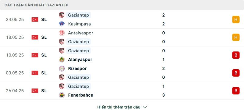 5 trận gần nhất của Gaziantep FK: D-D-L-L-L