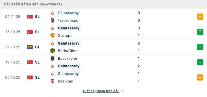 5 trận gần nhất của Galatasaray: D-W-W-W-D