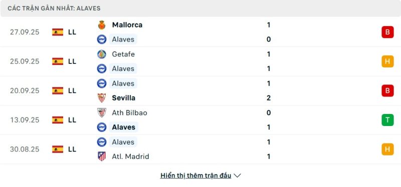 Alavés có khởi đầu mùa giải 2025/26 không mấy ấn tượng khi chỉ có 8 điểm sau 7 vòng đấu, đứng ở vị trí thứ 11 trên bảng xếp hạng. Dù thắng Levante 2-1, nhưng họ đã để thua trước Real Betis và Sevilla. Phong độ bất ổn này khiến đội bóng gặp khó khăn trong việc vươn lên các vị trí cao hơn. Các chiến thắng còn lại đều có vẻ khó khăn và thiếu thuyết phục, điều này cần được cải thiện trong thời gian tới. Alavés sẽ cần có một sự điều chỉnh để cải thiện thành tích.