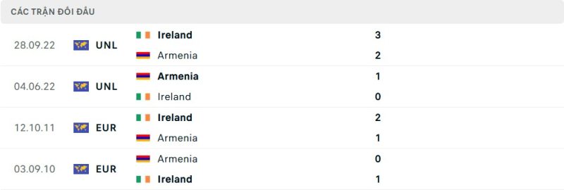 Thành tích đối đầu của Armenia vs Ireland