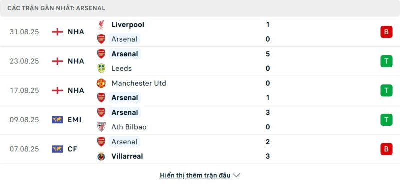 5 trận gần nhất của Arsenal: L-W-W-W-L