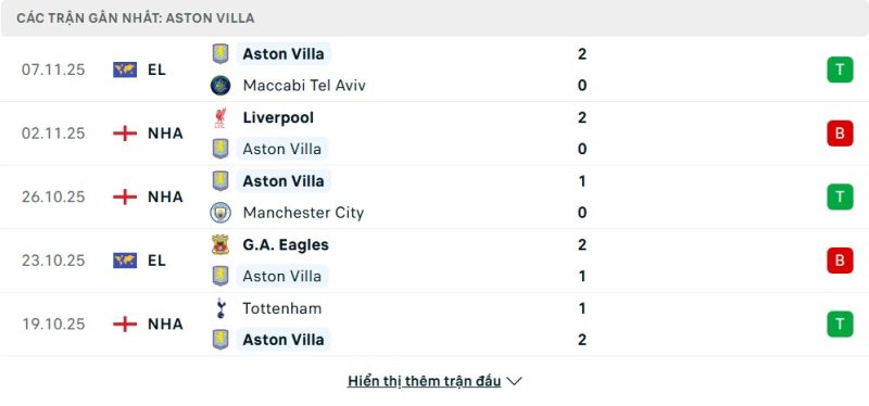 5 trận gần nhất của Aston Villa: W-L-W-L-W