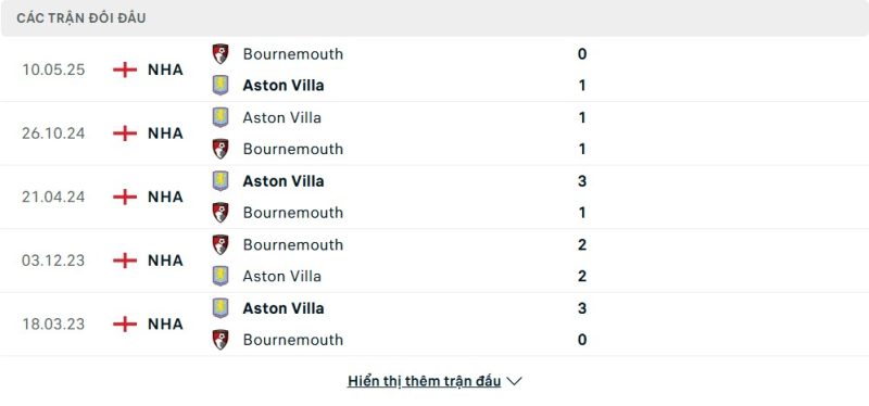 Thành tích đối đầu của Aston Villa vs Bournemouth