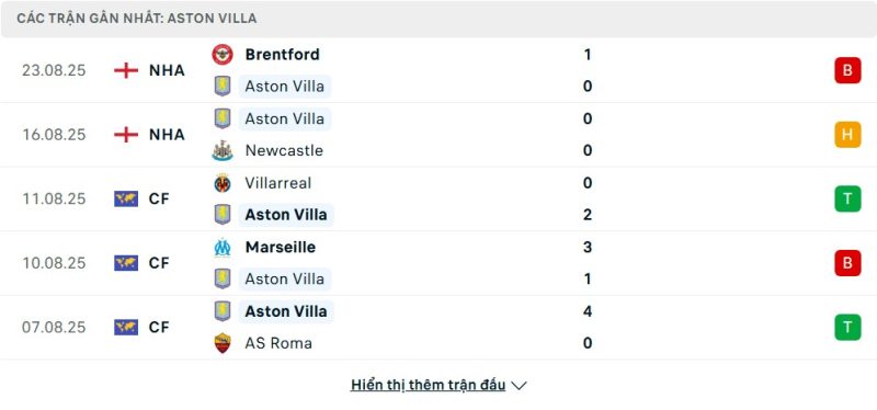 5 trận gần nhất của Aston Villa: L-D-W-L-W