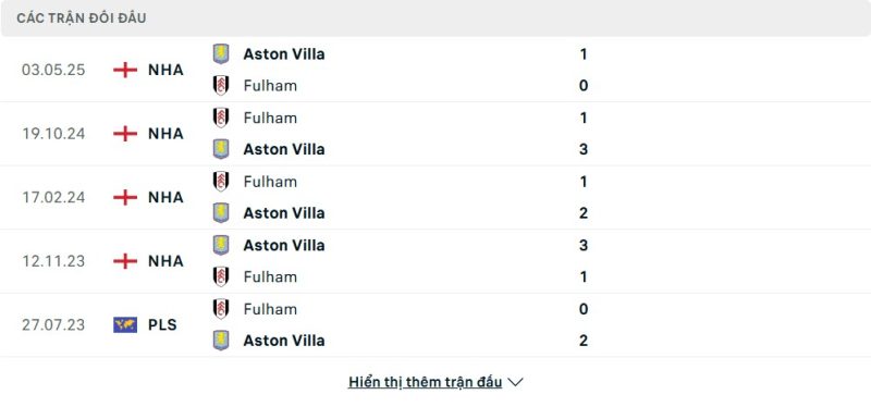 Thống kê phong độ gần đây Aston Villa vs Fulham