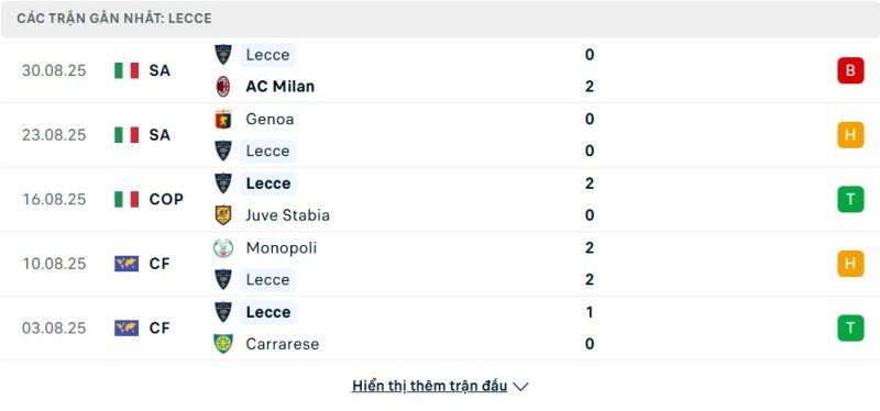 Lecce lại khởi đầu mùa giải với phong độ không mấy ấn tượng. Sau trận hòa trước Genoa ở vòng mở màn, họ đã để thua Milan ngay trên sân nhà. Thành tích này khiến Lecce chỉ có 1 điểm và tạm thời đứng ở vị trí 17 trên bảng xếp hạng Serie A. Dẫu vậy, đoàn quân của HLV Roberto D’Aversa vẫn cho thấy nỗ lực khi vượt qua Juve Stabia tại Coppa Italia. Một số trận giao hữu trong mùa hè cũng mang đến những dấu hiệu tích cực, nhất là chiến thắng trước Carrarese và Spezia. Tuy nhiên, Lecce vẫn cần cải thiện khả năng ghi bàn nếu muốn tạo bất ngờ trước các đối thủ mạnh.