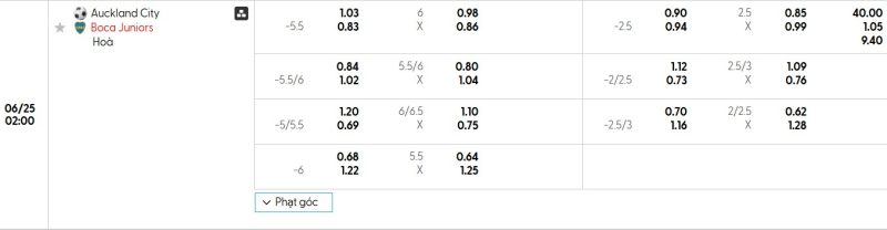 Bảng Tỷ lệ kèo bóng đá Auckland City vs Boca Juniors