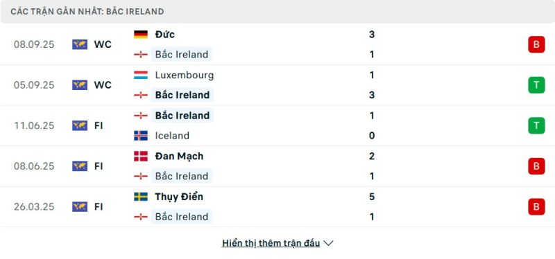 5 trận gần nhất của Bắc Ireland: L-W-W-L-L