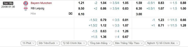 Bảng Tỷ lệ kèo bóng đá Bayern Munich vs RB Leipzig