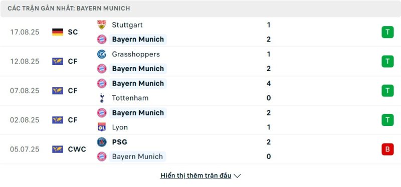 5 trận gần nhất của Bayern Munich: W-W-W-W-L