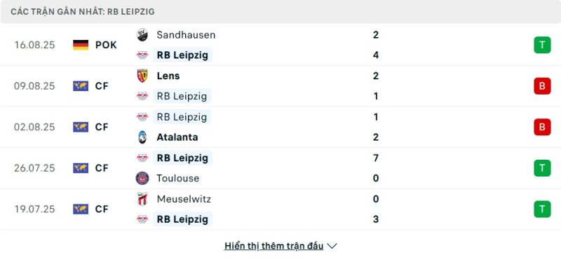 5 trận gần nhất của RB Leipzig: W-L-L-W-W