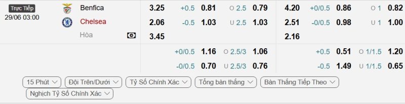 - Kèo tỷ số bóng đá hiệp 1: Benfica 1-1 Chelsea