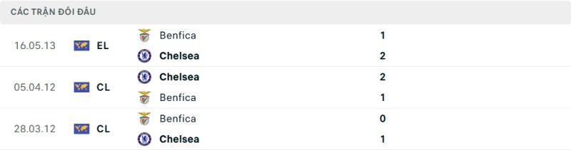 Thành tích đối đầu của Benfica vs Chelsea