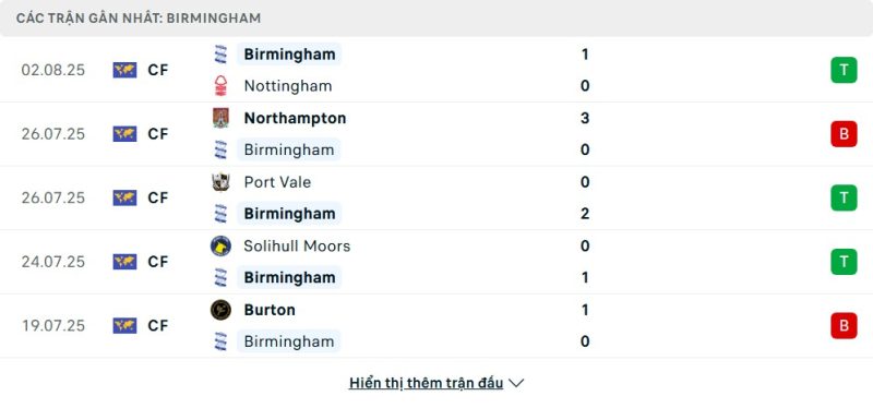 Birmingham City bước vào mùa giải 2025/26 sau khi cán đích ở nhóm giữa BXH Championship mùa trước. Trong giai đoạn chuẩn bị, họ thi đấu tổng cộng 6 trận giao hữu, giành được một số kết quả tích cực như thắng Nottingham 1-0 và Port Vale 2-0. Tuy nhiên, Birmingham vẫn cho thấy sự thiếu ổn định khi để thua Northampton 0-3 và Burton 0-1. Điểm sáng của đội là khả năng giữ sạch lưới ở một số trận, nhưng hàng công lại chưa thật sự bùng nổ khi thường xuyên gặp khó khăn trong khâu ghi bàn.
