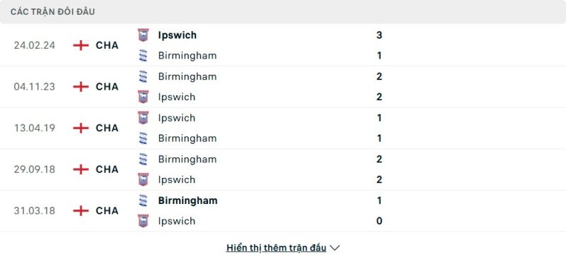 Thành tích đối đầu của Birmingham City vs Ipswich Town