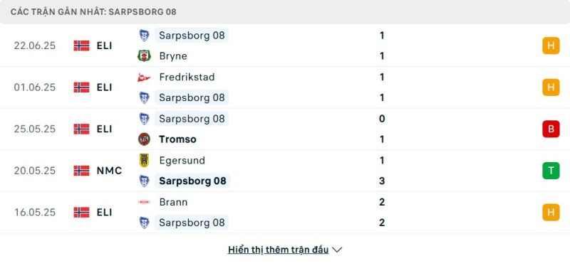 5 trận gần nhất của Sarpsborg: D-D-L-W-D
