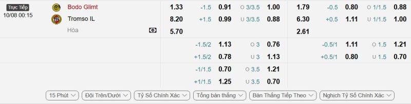 Dù được đánh giá cao hơn, Bodø/Glimt sẽ không dễ dàng áp đặt thế trận lên một Tromsø có tổ chức tốt. Nhiều khả năng, hai đội sẽ chơi đôi công ngay từ đầu, và bàn thắng có thể đến từ cả hai bên trong hiệp 1. Một tỷ số hòa ở 45 phút đầu tiên là kịch bản dễ xảy ra khi cả hai đều sở hữu hàng công sắc bén. Mức kèo tài xỉu mà nhà cái niêm yết là 1.25 với tỷ lệ cho tài là 0.88, tỷ lệ cho xỉu là 1.00, người chơi nên đặt niềm tin vào cửa tài cho hiệp đấu này.