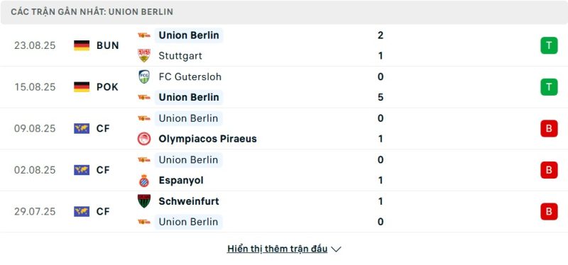 5 trận gần nhất của Union Berlin: W-W-L-L-L