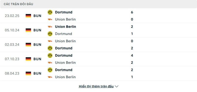 Thành tích đối đầu của Borussia Dortmund vs Union Berlin