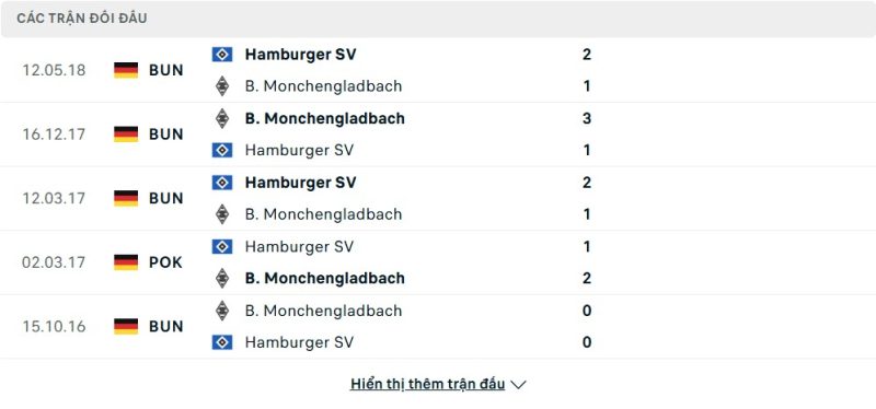 Thành tích đối đầu của Borussia Mönchengladbach vs Hamburger SV