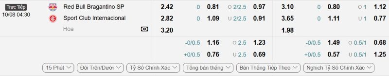 Bảng Tỷ lệ kèo bóng đá Red Bull Bragantino vs Internacional
