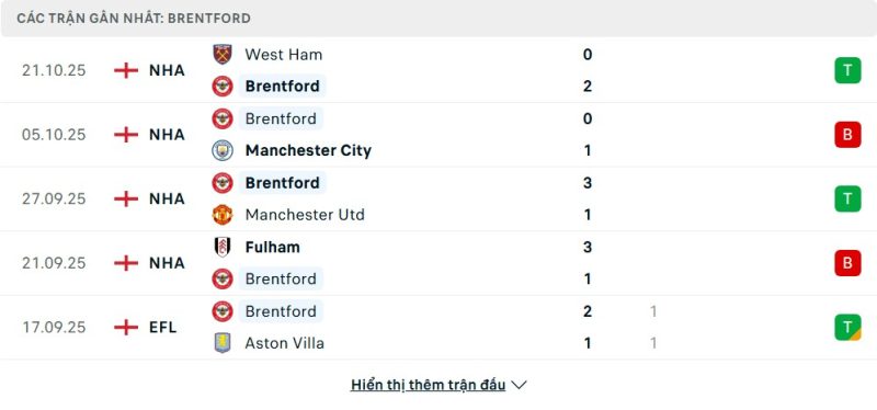 5 trận gần nhất của Brentford: W-L-W-L-D