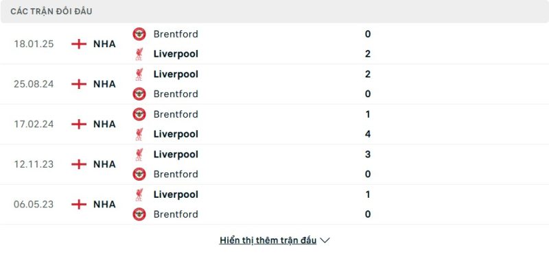 Thống kê phong độ gần đây Brentford vs Liverpool