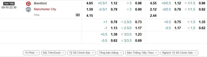 • Kèo tỷ số bóng đá hiệp 1: Brentford 1-0 Manchester City