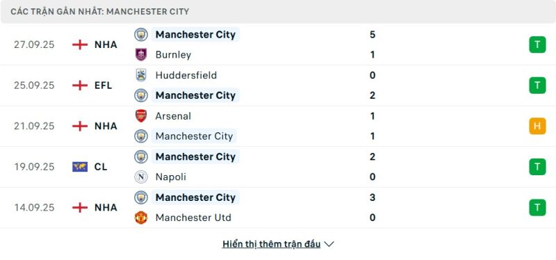 5 trận gần nhất của Manchester City: W-W-D-W-W