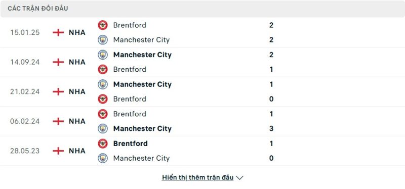 Thống kê phong độ gần đây Brentford vs Manchester City
