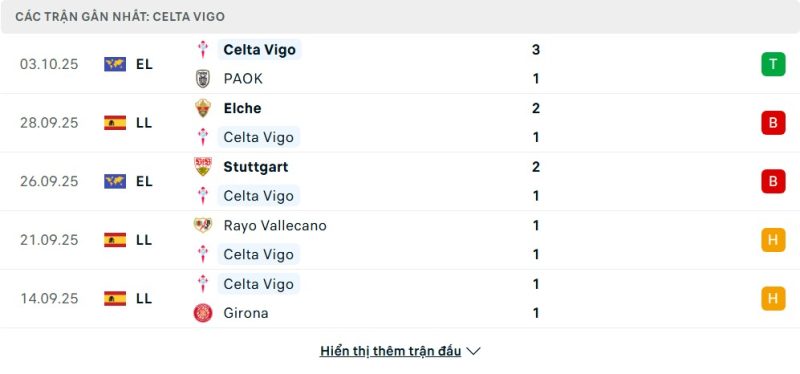 5 trận gần nhất của Celta Vigo: W-L-L-D-D