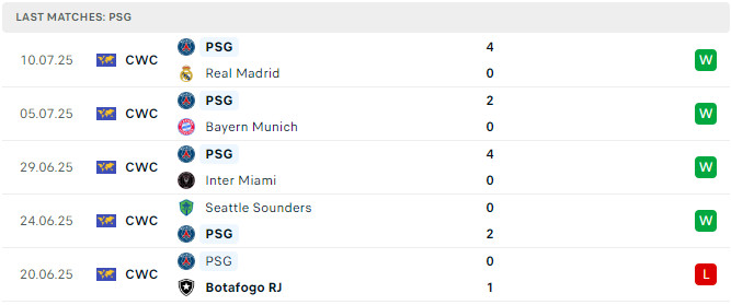 5 trận gần nhất của Paris Saint-Germain: W-W-W-W-L