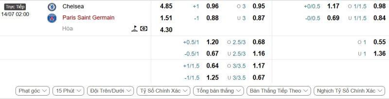 Bảng Tỷ lệ kèo bóng đá Chelsea vs Paris Saint-Germain