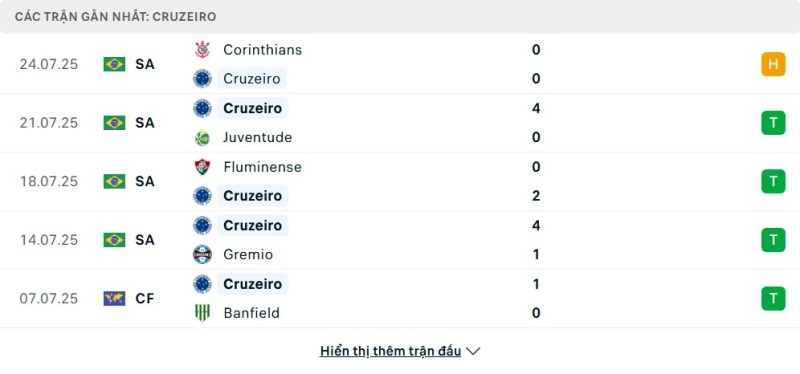 5 trận gần nhất của Cruzeiro: D-W-W-W-W