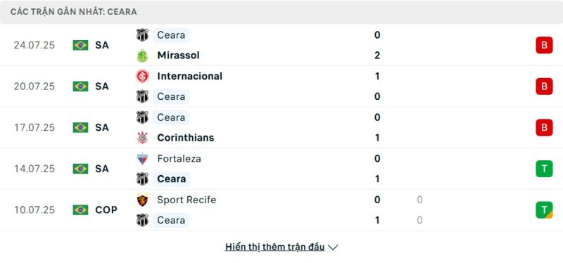 5 trận gần nhất của Ceará: L-L-L-W-D