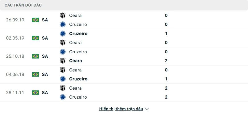 Thành tích đối đầu của Cruzeiro vs Ceará