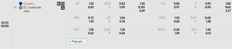 Bảng Tỷ lệ kèo bóng đá Cruzeiro vs Juventude