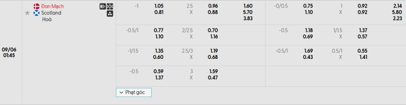 Bảng Tỷ lệ kèo bóng đá Đan Mạch vs Scotland