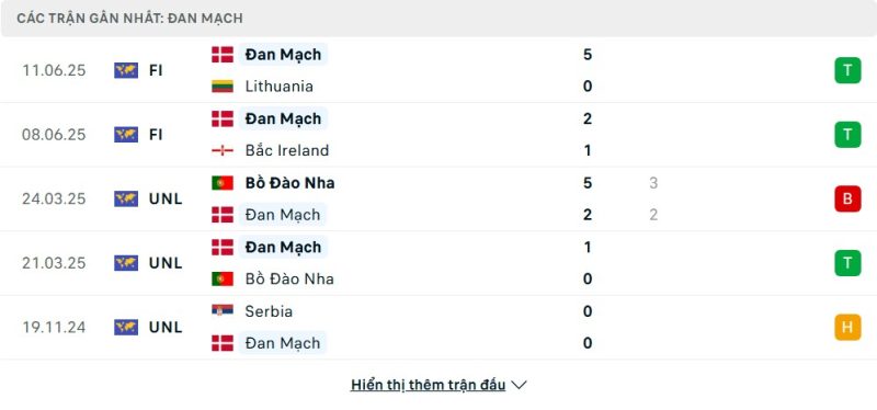 5 trận gần nhất của Đan Mạch: W-W-L-W-D