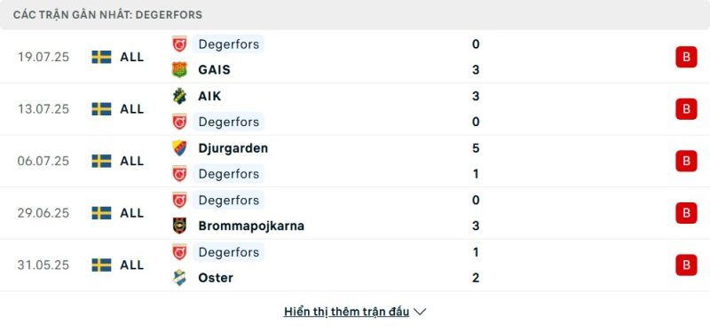 5 trận gần nhất của Degerfors IF: L-L-L-L-L