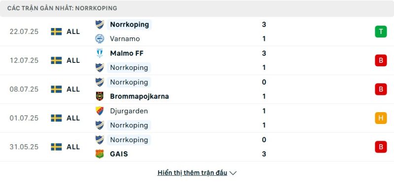 5 trận gần nhất của IFK Norrköping: W-L-L-D-L
