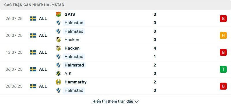 5 trận gần nhất của Halmstads BK: L-D-L-W-L