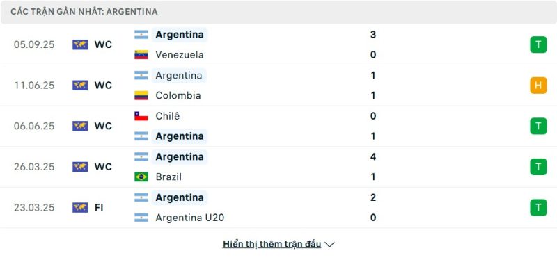 5 trận gần nhất của Argentina: W-D-W-W-W