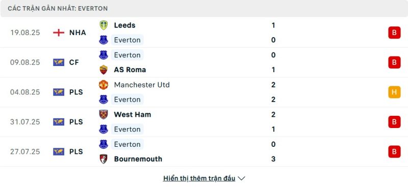 5 trận gần nhất của Everton: L-L-D-L-L