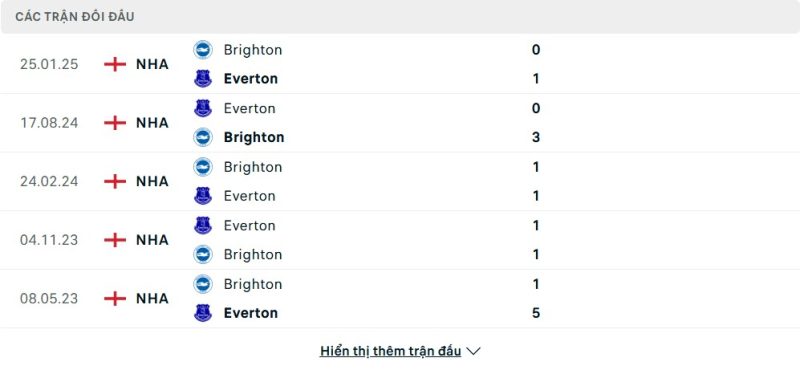 Thành tích đối đầu của Everton vs Brighton & Hove Albion