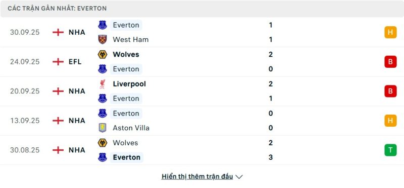 5 trận gần nhất của Everton: D-L-L-D-W