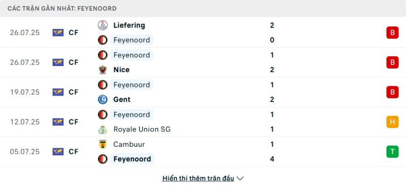 Sau khi kết thúc mùa giải Eredivisie 2024/25 với vị trí á quân, Feyenoord đã có một vài trận đấu giao hữu trước thềm mùa giải mới. Mặc dù có khởi đầu thuận lợi, nhưng phong độ của Feyenoord trong các trận đấu gần đây lại không mấy khả quan. Họ đã để thua 3 trong 5 trận đấu gần nhất, chỉ giành được 1 chiến thắng. Cụ thể, họ đã thất bại trước Liefering, Gent và Nice. Tuy nhiên, việc giành chiến thắng đậm 4-1 trước Cambuur cũng cho thấy đội bóng Hà Lan vẫn có khả năng bùng nổ.