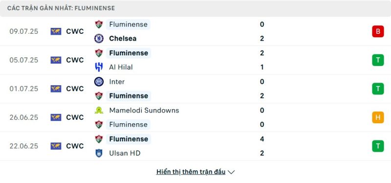 5 trận gần nhất của Fluminense: L-W-W-D-W