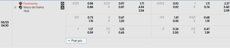 Bảng Tỷ lệ kèo bóng đá Fluminense vs Vasco da Gama