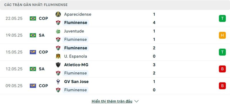 5 trận gần nhất của Fluminense: W-D-W-L-L